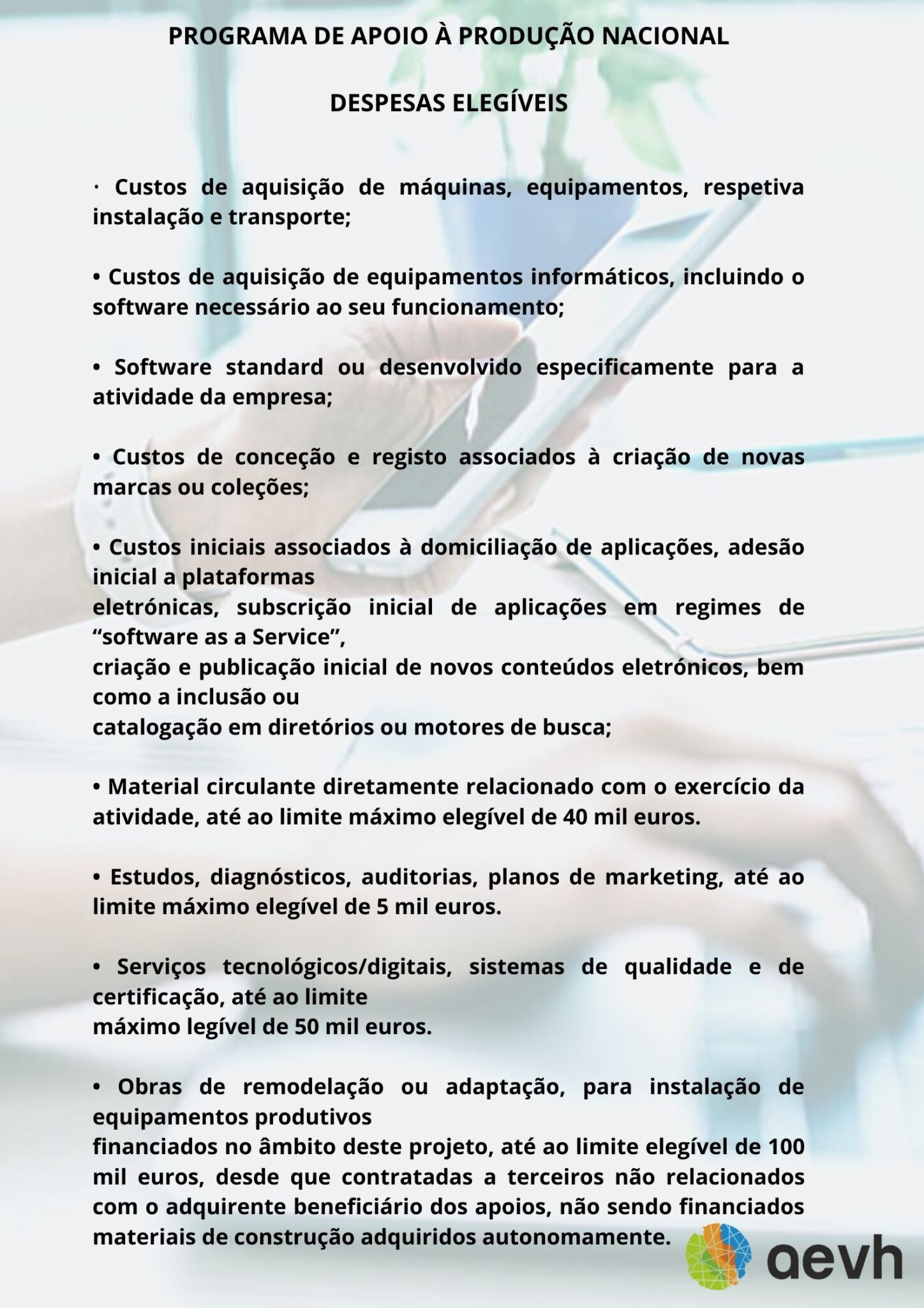 A AEVH PRESTA APOIO NA ELABORAÇÃO, SUBMISSÃO, ACOMPANHAMENTO E EXECUÇÃO DA CANDIDATURA!